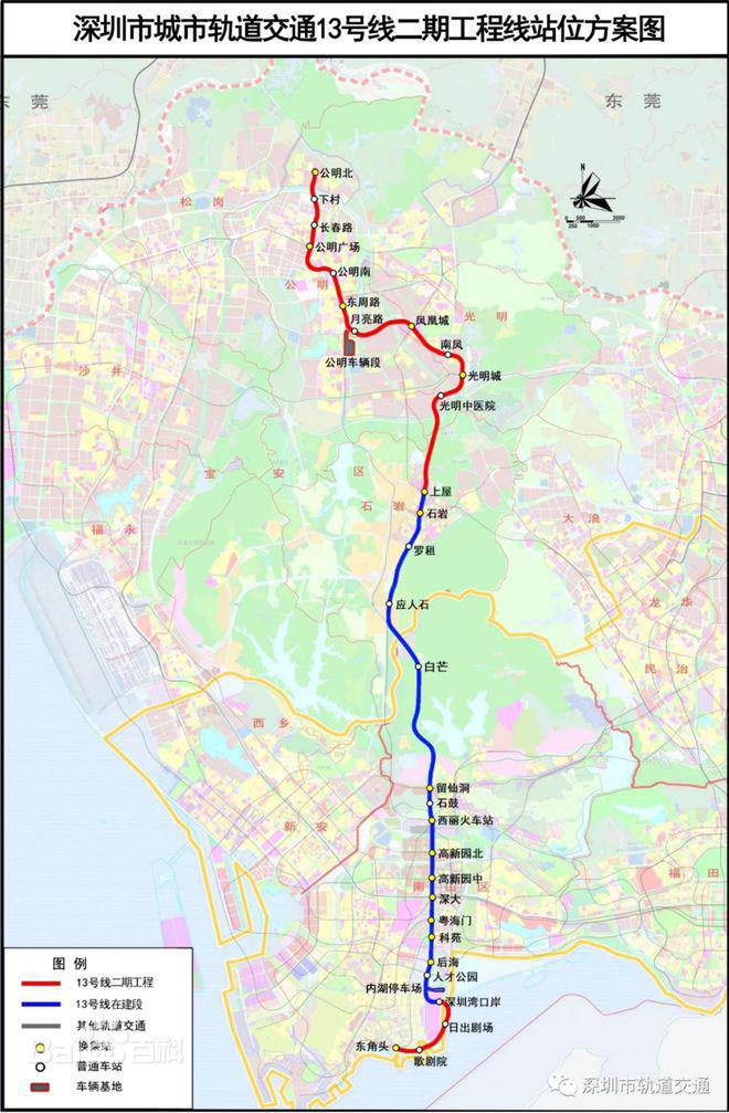 ①13号线及其南、北延长线年开通)起于东角头站,终于公明北站,纵贯光明、宝安、南山,线分钟可抵达南山核心区,约45分钟可达深圳湾口岸,以高新技术人才为主要客流,被称为高新技术人才专线号线(规划中)起于机场东站,终于公明北站,是连接光明、深圳西部中心及航城等外围组团中心的轨道线路,可快速通达粤港澳大湾区城市群及全球国际都市群,被称为国际机场专线