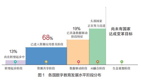 如图1所示,在62个国家中,13%的国家尚处于转型起步阶段,正在规划或刚启动数字教育基础设施与环境、数字教育资源等建设项目。68%的国家处于资源共享阶段,数字教育基础设施、数字教育资源建设情况相对较好,面向全民的数字教育资源体系已基本建成,正在大力推动数字教育资源的规模化普及应用。19%的国家已具备数据驱动阶段特征,正在将数据作为核心生产要素开展教学实践、教育治理、教育科研等多个方面的创新探索。其中,少数国家已制定“人工智能+教育”的专项发展规划,正在积极推动AI在教育中的创新应用。而作为更高一级的生态重塑阶段,则仍是各国数字教育的远景目标,尚未有国家进入该发展阶段。