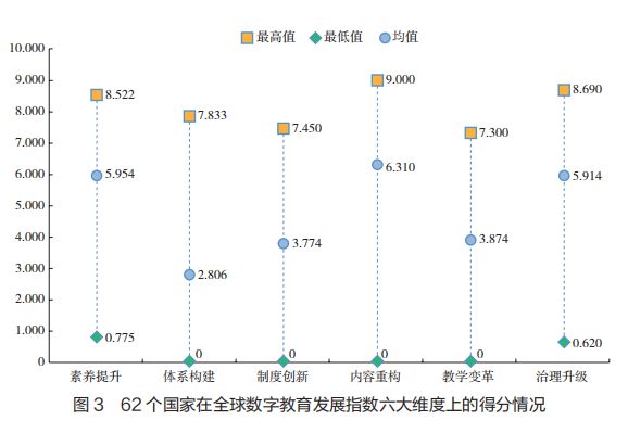 在全球数字教育发展指数六大维度中,62个国家在内容重构、素养提升、治理升级三大维度上的发展情况相对较好,平均得分超过5分;内容重构、治理升级两个维度的发展差异最大,最高分和最低分的差异值均大于8分(见图3)。